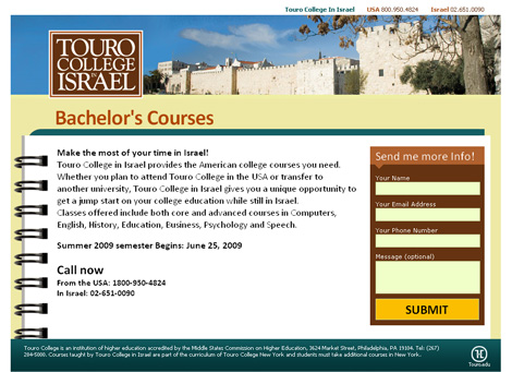 Following the branding look-and-feel previously created by MTM, we designed a landing page template used for all of Touro College in Israel's various courses in order for TCI to gauge interest in particular classes enable them to compile a list of potential students.