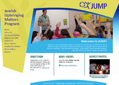 JUMP stands for Jewish Upbringing Matters Program, and is an organization that provides Jewish after-school classes to public school students in South Florida. JUMP is a project of Afikim Foundation. JUMP requested a bright and exciting site, inviting parents to sign up for their program. MTM also incorporated an extensive back-end, complete with photo gallery capabilities. Visit the site at www.jewishafterschool.com.