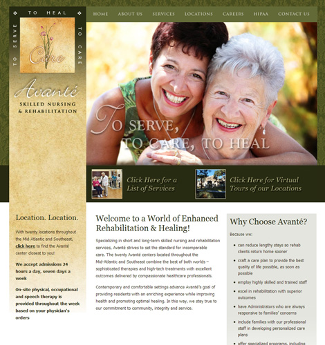 Avante is a network of health-care facilities across the US east coast. They turned to MTM for design and website development. Starting from a excellent design by Matt Granat of granatdesign.com, we provided an automated applicant tracking system for managing Avante's 10,000+ job applications. MTM also delivered a content management system, complete with video tutorials, for comprehense management of all website content. Visit the site at www.avantecenters.com.