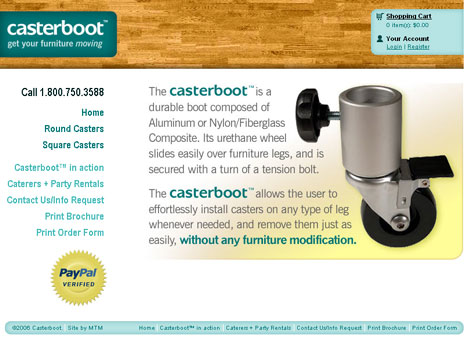 The Casterboot is a durable boot made of Aluminum or Nylon/ Fiberglass Composite. It features a urethane wheel that slides easily over furniture legs and is secured with a turn of a tension bolt, allowing even the heaviest pieces of furniture to be moved with great ease and without any long-term modification. MTM created the Casterboot e-commerce site to easily allow the purchasing of any Casterboot product, along with detailed information of all the products available. The site includes a content management system that allows the company to add, remove and edit products with only a few clicks. Visit the Casterboot website at www.casterboot.com.